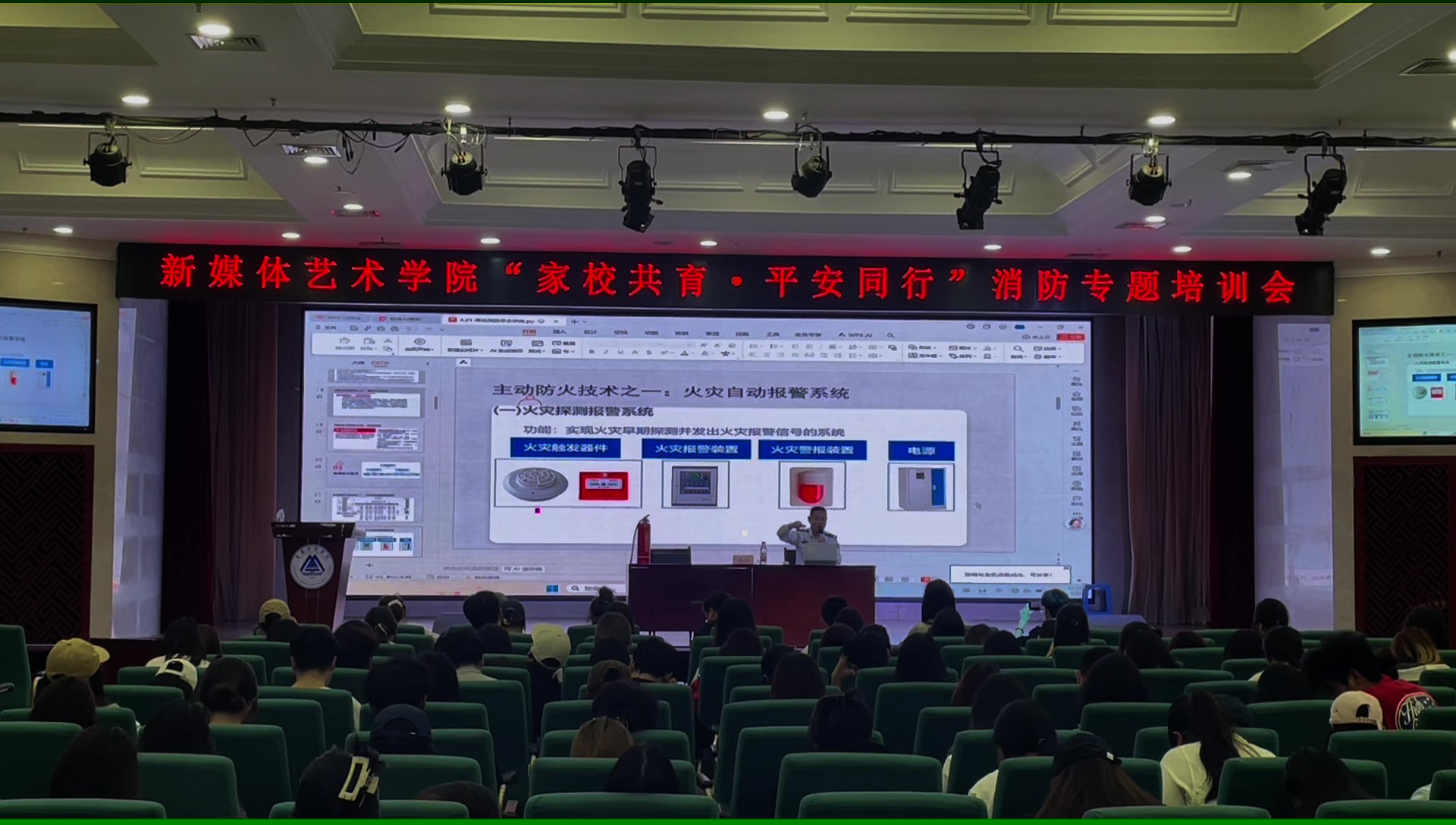 为深化校园消防安全教育,创新安全教育形式,整合优质教育资源,2026年4月23日下午,我校新媒体艺术学院在学术报告厅成功举办“家校共育·平安同行”消防安全专题培训会。本次培训特邀新媒体艺术学院2023级学生家长、重庆市合川区消防救援局副局长王瑞强同志担任主讲人,新媒体艺术学院党总支书记倪倩茜、全体专职辅导员、寝室长及学生代表,近两百名师生参加培训。